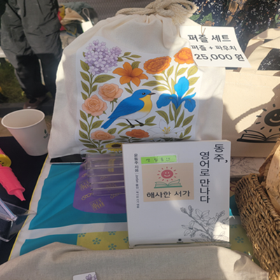 웬 영어 교재가...? 눈길을 끄는 작품하나가 공동부스에서 눈길을 끈다. “시니어분들을 위한 영어 교재인 ‘동주, 영어로 만나다’입니다. 영어를 막 시작하는 어르신을 위한 교재입니다.” 독립출판 ‘해사한 서가’에서 나온 작품이다. 영어를 처음 배우는 어르신들이 윤동주의 시로 영어 학습을 쉽게 할 수 있도록 구성된 교재다. 책 속 글자는 크고 또렷하며, QR코드를 찍으면 발음 영상을 들을 수도 있다. 아이디어가 참 기발하다. ‘해사한 서가’의 독특한 책뿐 아니라, 어르신들이 쓰기 쉽게 조각 크기를 키운 퍼즐과 그 퍼즐을 담기에는 아까울 만큼 정성스럽게 디자인된 파우치도 눈길을 끌었다.