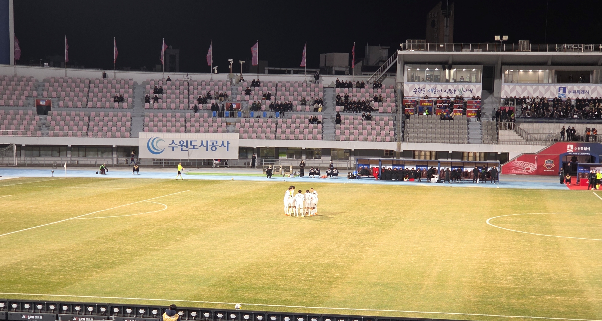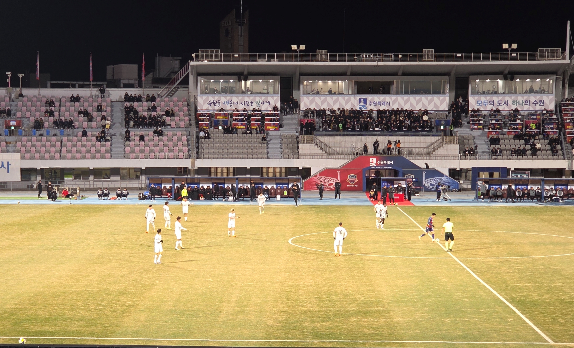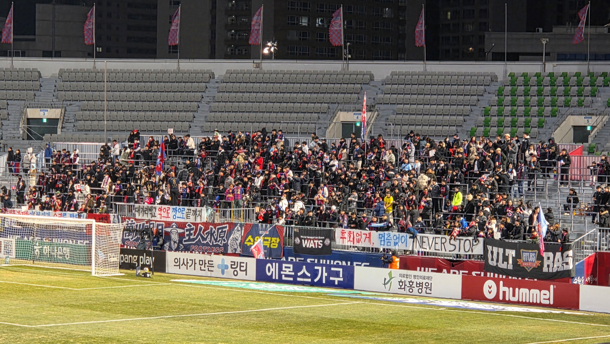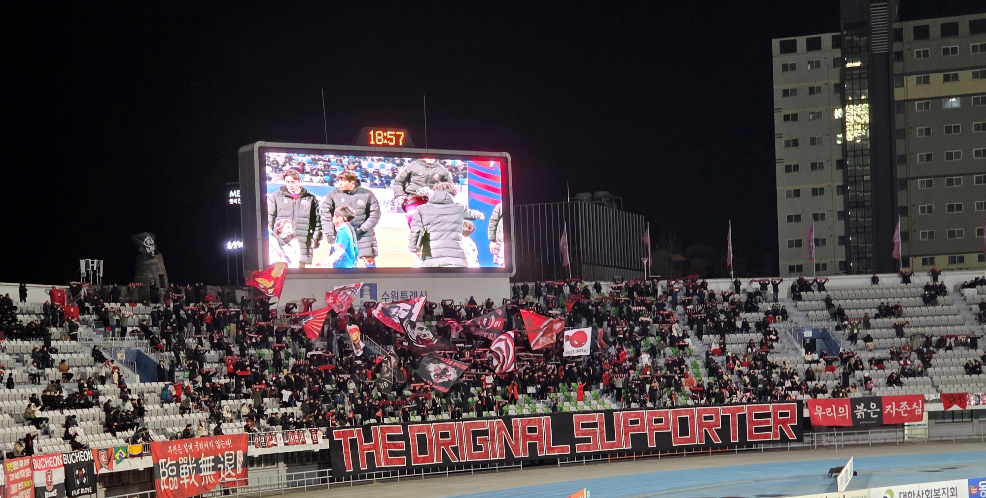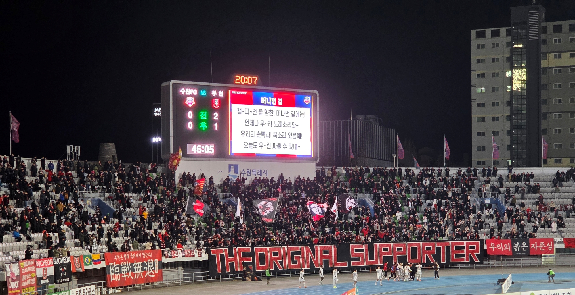 2025년 12월 8일 저녁, 수원종합운동장은 경기 시작 전부터 이미 붉은 색으로 물들어 있었다. 하나은행 K리그 승강 플레이오프 2차전. 1차전 1-0 승리를 안고 원정에 나선 부천FC1995는 이날 반드시 승격을 확정 지어야 하는 중압감 속에서도 자신감 넘치는 표정을 보였다. 추운 날씨에도 불구하고 부천에서 수원까지 이동한 시민들은 두꺼운 외투를 둘러매고 서로를 바라보며 "오늘은 부천 역사에 이름을 새기는 날"이라며 결의를 다졌다.