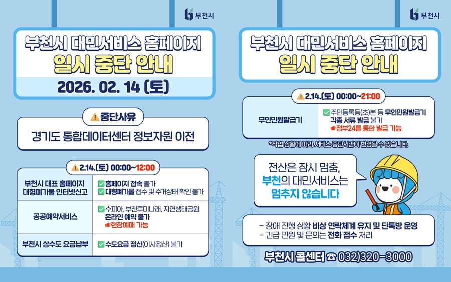 시는 서비스 중단 이전에 홈페이지·블로그·사회관계망서비스(SNS) 및 무인민원발급기 안내문을 통해 관련 내용을 알리고, 대체 이용 방법을 알리고 있다. 또한 설 연휴 동안 문의가 많은 생활 정보는 부천시 블로그 등 대체 채널을 통해 지속 안내하고, 당직 민원은 무선통신망을 활용해 차질 없이 대응할 방침이다.